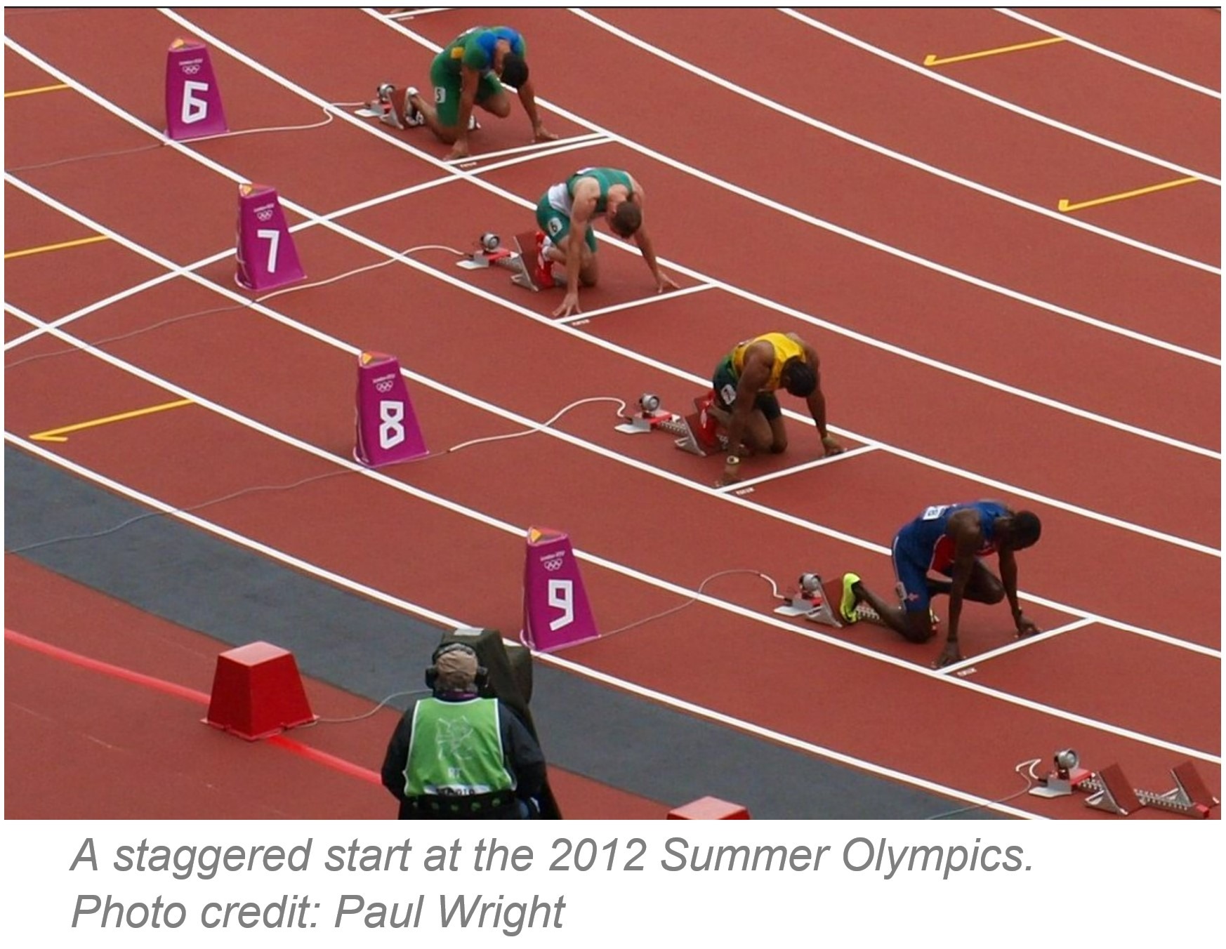 Some short-middle distance track & field races use a “staggered start” that adjusts runners’ starting positions to account for the curvature of the track (i.e., runners in the outer lanes start further ahead to compensate for the fact that those lanes have a larger circumference). But while this makes the physical distance equal, it can impact the race in other ways. Racing from the farthest outside lane, for instance, is considered to be more difficult because starting in front of the competition limits any real visual contact with the other runners. This makes it more difficult to gauge the speed of the field and pace yourself to victory. You are truly forced to run your own race. And this is where van Niekerk set his record.