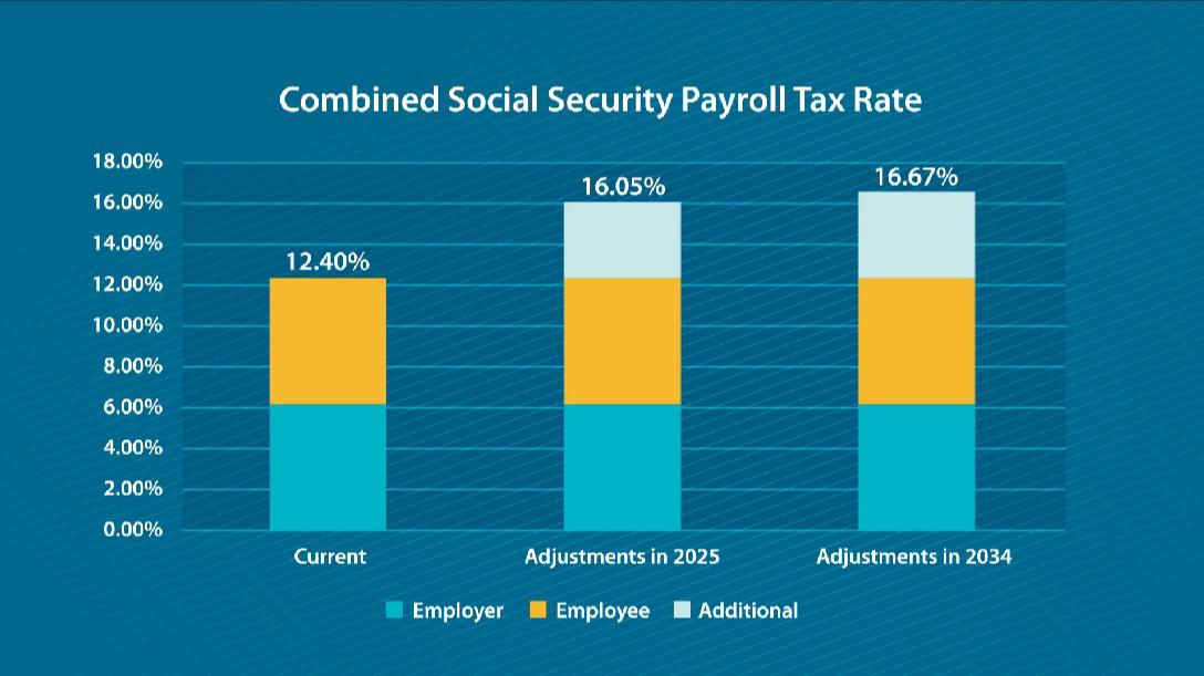 2. Tax Increases: On the other hand, Congress could raise payroll taxes. Currently, employees and employers each pay 6.2% on the first $176,100 of wages for a total of 12.4%. If you’re self-employed, you pay both portions of that tax. To address today’s funding challenges, payroll taxes would need to increase by 3.65%. If delayed until 2034, the required increase jumps to 4.27%.