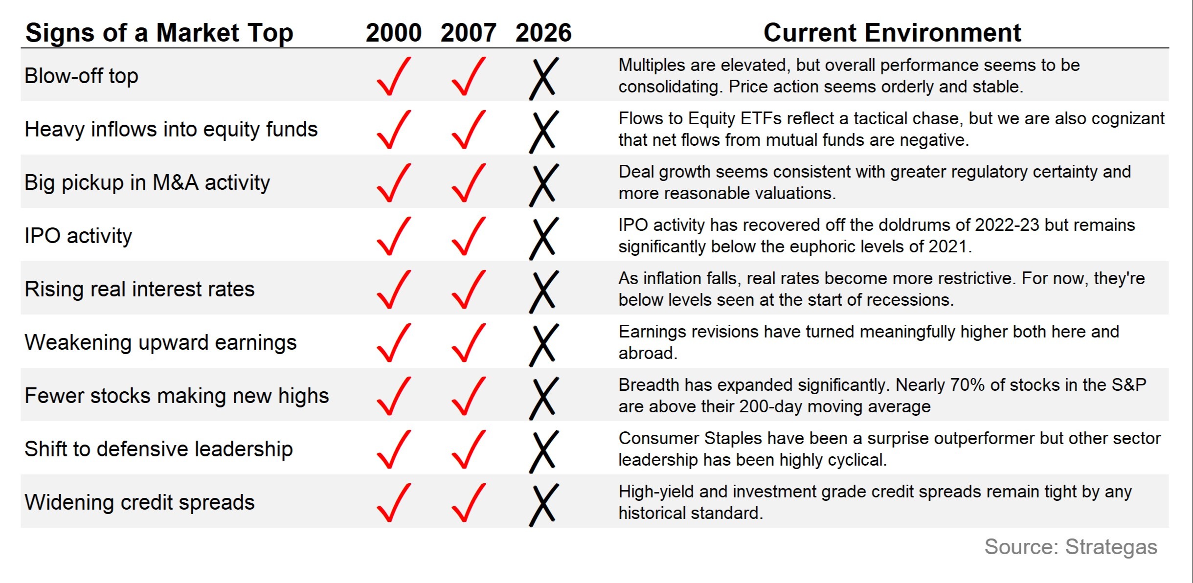 If we broaden our focus from “is it a bubble?” to “is the bull market in danger?” the signs pointing to a “yes” are still difficult to find. Our partners at Strategas (a Baird Company) publish a Bull Market Top Checklist (shown in the table below) as a way to measure the status of a bull market at any given time. As Strategas writes, “Not a single element of our checklist suggests that the broader market is in danger. Earnings growth remains robust, long-term interest rates are quiescent, and market leadership has broadened beyond the Technology sector. Some consolidation in Tech, in our opinion, increases the chances that the bull market continues to run.”