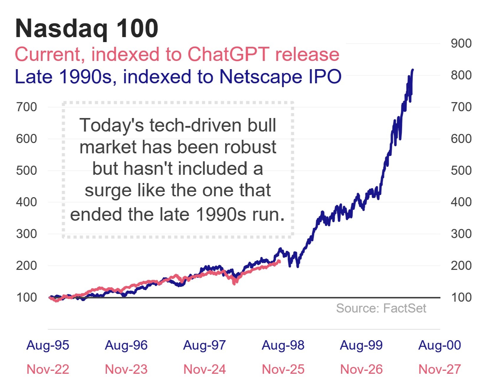 Chris Verrone, chief market strategist at Strategas (a Baird company), recently answered the question of whether the market is in a bubble, and concluded with an offhand comment that people forget “how potent late 1999 and early 2000 were.” I couldn’t agree more. The chart to the right shows the Nasdaq 100 in the late 1990s (indexed to Netscape’s IPO) and today (indexed to ChatGPT’s release). For roughly three years, the two markets look similar—strong performance, but no parabolic rise, euphoric sentiment, or FOMO buying associated with a bubble. At some point in the late 1990s, however, things shifted. From Oct. 1998 to Mar. 2000, in just 17 months, the Nasdaq more than quadrupled. Bubbles, as noted above, are hard to define. But if we are comparing today’s AI bull market to the late 1990s boom, the truly bubbly part of the ride has not yet begun.