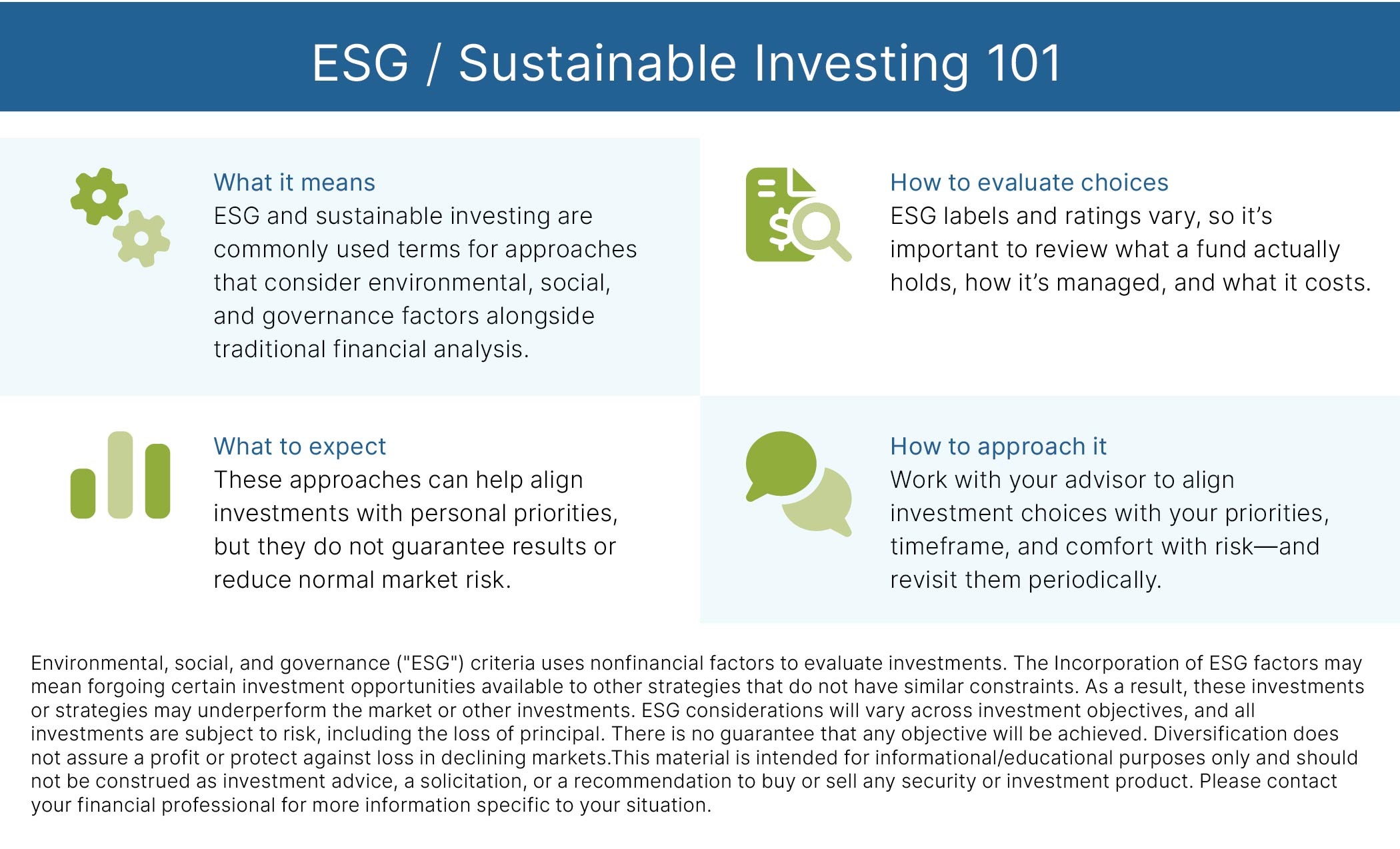 More investors are not only asking how their money grows, but also what it supports. That’s where environmental, social, and governance (ESG) investing comes in—also called sustainable investing. Put simply, it’s an approach that considers a company’s impact on the environment, people, and leadership practices alongside its financials. It can allow you to align your portfolio with your values while staying diversified and thoughtful about risk.