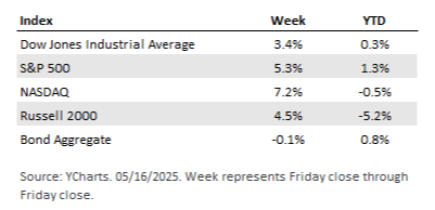 Outlook A proposed congressional bill being referred to as "One Big Beautiful Bill" is a comprehensive package that combines tax policy changes, spending cuts, and other initiatives. This bill has passed the House Budget Committee edging closer to a floor vote. The bill also led to a downgrade of U.S. Treasury Bonds from AAA to AA+ by Moody's credit rating agency. Moody's points to "large annual fiscal deficits and growing interest costs" as primary risks driving the downgrade.1 Prior to this downgrade, Standard & Poor's and Fitch, the other two largest credit rating agencies, had already lowered U.S. Treasury Bonds from their AAA rating in 2011 and 2023, respectively. In practical terms, the U.S. risk of not repaying principal of bonds they issue remains extremely low in our opinion. Long term risks of higher deficits and interest costs do, however, create significant potential problems to the economy. Higher debt service (government spending on interest and principal) could lead to higher interest rates further exacerbating debt service — spiraling the wrong direction. Higher debt service means less fiscal flexibility as a higher percentage of government spending is focused on debt and less on other programs. Finally, higher interest rates also imply a "crowding out effect" where it becomes more difficult to raise private capital - ultimately stymying economic growth. In any regard, all 3 major rating agencies have fired warning shots on U.S. deficits and debt. Let's hope that rating upgrades are somewhere on the horizon. For investors, we do not see major immediate risks aside from a potential modest rise in yields. . . . U.S. equities rose solidly in the prior week as sentiment lifted sharply on news of positive trade developments. On Monday, the U.S. and China agreed to a 90-day period of reduced tariffs while the two countries work toward a longer-term deal.2 The U.S. administration also announced plans to ease restrictions on artificial-intelligence chips in hopes to enable trade agreements with the U.S. and other countries.3 The recent trade negotiations (even if temporary) helped improve investor sentiment and contributed to a boost in the tech sector. In addition to evolving trade developments, the markets also received its first hard data read regarding the impact of tariffs on inflation. This week’s announcement of the Consumer Price Index (CPI) and Producer Price Index (PPI) – suggest the actual impact of trade policies on inflation and the economy seems to be limited for now, despite soft-data from consumer and business confidence and sentiment surveys demonstrating uncertainty as of late. Headline CPI rose only 0.2% month-over-month, a surprising soft outcome, bringing the annual inflation rate to 2.3%, the lowest since February 2021. Excluding the volatile categories of food and energy, core CPI increased 0.2% for the month, while the annual core inflation rate remained at 2.8%. Both headline and core CPI readings came in lower than forecasted and signaled moderating inflation over a three-month period. Shelter prices drove much of the rise, as it accounts for one-third of the index weighting, and rose 0.3% in April, contributing to over half of the overall move. Other influential components include a rise in energy prices (up 0.7% after declining -2.4% in March), while medical care services also saw a 0.5% rise. Partially offsetting the gains, used vehicle prices saw its second monthly drop (down -0.5%), apparel costs were also down -0.2%, and egg prices tumbled -12.7% (although still up 49.3% from a year ago). Overall, the April CPI figures suggest no severe tariff impact on consumer prices. This may be explained through a buildup of inventory from businesses (as seen in furnishings, chemicals, and autos), or through producers absorbing some costs. Both scenarios provide a buffer to delayed price hikes. Economists suggest that even with the easing of 145% reciprocal tariffs on China, inflation numbers will likely rise again in the coming summer months.4 To what degree and duration remains uncertain. In the prior week, the markets celebrated the positive trades developments and better-than-expected inflation reports leading to outsized gains, pushing the S&P 500 benchmark back into positive territory YTD. The S&P 500 advanced 5.3% (up 1.3% YTD), while the tech-heavy Nasdaq jumped 7.2%, and the blue-chip Dow rose 3.4%. |