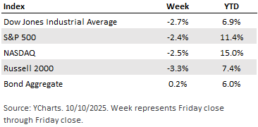 Friday's sell off was the result of a threat to raise tariffs on Chinese goods by an additional 100%, which was in retaliation for China's new global trade restrictions on rare earth materials. Tariffs of this magnitude scare stock market investors as the consequences would likely be a slowdown in economic growth, inflation, and job losses. Presidents Trump and Xi are set to meet at the end of October, but we expect fits of trade-related volatility until some sort of agreement is reached - either before, during, or after the meeting.