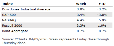 Outlook Despite the concerns related to Operation Epic Fury and the rising supply constraints and prices of oil, companies appear to be in good shape from an earnings perspective. According to FactSet, companies in the S&P 500 are exhibiting their most optimistic outlook in nearly five years.1 Specifically, 54% of the 110 companies providing Q1 2026 guidance are issuing positive EPS projections. This trend is anchored by the lowest number of negative preannouncements since late 2021. Furthermore, overall corporate sentiment is bolstered by 77 companies issuing positive revenue guidance, the highest count since tracking began in 2006. This broad-based optimism across key sectors like Technology, Industrials, and Consumer Discretionary suggests a robust fundamental environment as we head into the new fiscal year. Beyond the first quarter, Wall Street analysts are estimating a year-over-year earnings growth rate of 17.4% for the full calendar year 2026. While we will continue to look for signs of weakness related to rising input costs, for now, maintaining a constructive view on the market seems to make sense. . . . U.S. equity markets navigated a volatile transition from late March into early April as investors balanced geopolitical risk, rising energy prices, Federal Reserve messaging, and a heavy slate of economic data. While markets showed brief signs of stabilization late in the week, uncertainty around inflation and global risk remained elevated. Geopolitical Tensions and Energy Prices Market volatility was largely driven by ongoing Middle East tensions involving Iran and disruptions near the Strait of Hormuz. Oil prices surged sharply, with WTI crude briefly exceeding $110 per barrel and Brent moving above $105, reflecting fears of sustained supply disruptions. While higher energy prices added near term inflation pressure, markets appeared increasingly able to absorb the shock, particularly as corporate earnings expectations remained intact. Energy stocks benefited from stronger pricing, helping offset weakness in more rate-sensitive sectors. Importantly, despite elevated oil prices, broader economic activity has so far remained resilient, suggesting that higher energy costs have not yet translated into a meaningful slowdown in demand. Federal Reserve Outlook and Interest Rates Markets continued to digest the Federal Reserve’s March policy meeting, where officials reaffirmed a “higher for longer” stance on interest rates. While the Fed held policy rates steady, updated projections showed upward revisions to inflation forecasts and modest improvements in growth expectations, reinforcing the view that rate cuts in 2026 may be limited and potentially delayed. Treasury yields moved higher earlier in the week, with the 10 year yield approaching the upper end of its recent trading range, before easing as markets reassessed growth prospects and incoming data. Jobs Report & Other Influential Economic Data Friday’s March employment report, released April 3, showed job gains of approximately 178,000, well above consensus expectations, signaling resilience in the labor market despite recent financial and geopolitical stress. The unemployment rate edged down to around 4.3%, while wage growth remained moderate.2 The report sent a mixed but generally encouraging signal about the U.S. economy. On the positive side, it reinforced the economy’s underlying strength and reduced immediate recession fears. While the data also supported the Federal Reserve’s cautious stance, as steady job growth suggests the Fed has less urgency to cut rates in the near term. Additional data releases supported this constructive view. Weekly jobless claims remained near historically low levels, and the latest S&P Global Manufacturing PMI signaled continued expansion, with improving new orders.3 Although input and energy costs have risen, overall demand trends remain intact. Consumer spending and trade data further underscored the economy’s underlying momentum, even amid higher costs.4 Taken together, these releases portray an economy that remains resilient, though increasingly challenged by cost pressures and external risks. Equity Market Performance Equity markets closed March with a sharp pullback, briefly pushing major indices toward correction territory and marking the S&P 500’s weakest monthly performance since 2022. However, as April began, markets found firmer footing, aided by improving earnings sentiment, resilient economic data, and renewed risk appetite. By the end of the shortened holiday week, major indices posted modest gains, snapping a five-week losing streak. While volatility remains elevated, recent price action suggests that markets are increasingly focused on fundamentals rather than headlines.