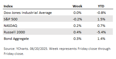 Outlook Mild economic headwinds may put a cap on positive growth surprises for the remainder of 2025. In keeping the overnight lending rate target (Fed Funds rate) at 4.25% to 4.5%, the Federal Reserve has maintained a somewhat hawkish posture, given that most measures of inflation are approximately 2% lower than overnight lending rates. A hawkish posture, while keeping inflation in check, tends to keep growth in check as well. Further, both initial and continuing unemployment claims have been trending higher, indicating increased caution among employers.1 Despite the headwinds, we still believe the economy will grow overall for the year, given the solid overall health of the U.S. consumer, businesses, and the banking system. . . . Much of the focus last week centered around the monetary policy meeting, specifically on Fed Chairman Jerome Powell’s remarks about the economy, future expectations for growth and inflation, along with potential impacts of tariffs. The Federal Reserve concluded its June Federal Open Market Committee (FOMC) meeting on Wednesday, maintaining the target Federal Funds rate in the range of 4.25 – 4.50%, where it has been since December.2 The Fed Funds rate has been lowered by 100 basis points in the past year, but there have been no rate cuts in 2025. The move was widely expected and marks the fourth consecutive meeting of pauses. Fed officials have been consistent in their messaging, stating they are taking a cautious approach, particularly when it comes to gauging the potential economic impact of tariffs. Along with the rate decision, the Federal Reserve updated the “dot plot” projections to provide insight into the Fed’s rate cut decisions, future expectations for rates, and its outlook on the economy.3 The closely watched dot plot showed the central bank stuck with its forecast for two rate cuts this year. However, policymakers expect to see inflation remain elevated and lower economic growth ahead. Additionally, more policymakers voted for no rate cuts this year, 7 out of 19 (previously only 4 in March). However, the policy statement pointing to two rate cuts this year was approved unanimously by the committee. While the dispersion in projections indicates some uncertainty from Fed officials about future cuts, the average outlook points to a fed funds rate of around 3.4% in 2027. Overall, the projections suggest a gradual easing of monetary policy over the next couple of years, while currently remaining restrictive. Other plots indicate potential pressures, with participants revising the gross domestic product (GDP or “economic growth”) forecast to increase by 1.4% in 2025, while inflation sits at 3%. The revision represents a 0.3% reduction in GDP. This may be reflective of the negative growth print in Q1, largely due to a pull forward in imports (which is subtracted from the growth calculation). During the press conference, Fed Chairman Jerome Powell suggested, “For the time being, we are well-positioned to wait to learn more about the likely course of the economy before considering any adjustments to our policies”. The equities market reacted little to the news and finished the week roughly flat, with some impact from geopolitical tensions. For the week, the Dow Jones remained unchanged, the S&P 500 was down 0.2%, while the Nasdaq Composite was up 0.2%. |