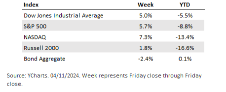Outlook Currently, the CNN Fear & Greed index sits at a lowly 13 on a scale of 0-to-100.1 Very low levels like today are often associated with market lows and, therefore, often more opportunistic in nature. However, the tariff tantrum is turning into a saga, and it feels like we haven't quite reached the story's climax. As stock investors, we look at a company's safety, long-term growth pathway, and valuation. For some companies, specifically those that rely on a healthy relationship with China, the tariff saga focuses our efforts on safety and growth potential. That said, while a majority of our investments have limited (if any) direct exposure to China, for some, we will continue to err on the side of caution. . . . The U.S. equity market recouped some of its recent losses following the postponement of the tariffs announced on April 2nd. All major indexes finished solidly higher for the week, with the S&P 500 posting its best weekly advance since early November 2023.2 Tariff developments between the U.S. and the rest of the world continued to dominate headlines, further driving market volatility. The world's two largest economies, the U.S. and China, raised tariff rates against each other further contributing to trade war worries.3 However, the markets exhibited an explosive rally following President Trump’s announcement of a 90-day pause on reciprocal tariffs for all countries except China. The pivot signals a willingness to work towards a solution, opening the door to negotiations. Following the move, the S&P 500 spiked more than 9% marking its best intraday performance since 2008. While the tech-heavy Nasdaq Composite had an even heftier rebound posting up more than 12% marking its second-best day ever. The spike in market turbulence, reset of valuations, and rising optimism regarding the de-escalation of a trade war could suggest that stocks may find support. However, a mix of positive and negative headlines could prompt a bumpy path ahead. On the economic front, investors received key inflation data from the Consumer Price Index (CPI) and Producer Price Index (PPI). Both headline inflation measures slid unexpectedly for March. The CPI year-over-year rate eased to 2.4%, down from 2.8% in February. Excluding food and energy, the annual core rate fell to 2.8%, the lowest rate since March 2021. On the corporate earnings front, big banks kicked off the start of the first-quarter earnings season on Friday led by JPMorgan, Wells Fargo, Morgan Stanley, and BlackRock. Additional notable names reporting this week include Goldman Sachs, J&J, Bank of America, Citigroup, United Airlines, Abbott Labs, and Taiwan Semiconductors, among others. For the week, the S&P 500 and Dow Jones rose 5.7% and 5.0%, while the Nasdaq Composite jumped 7.3%. |