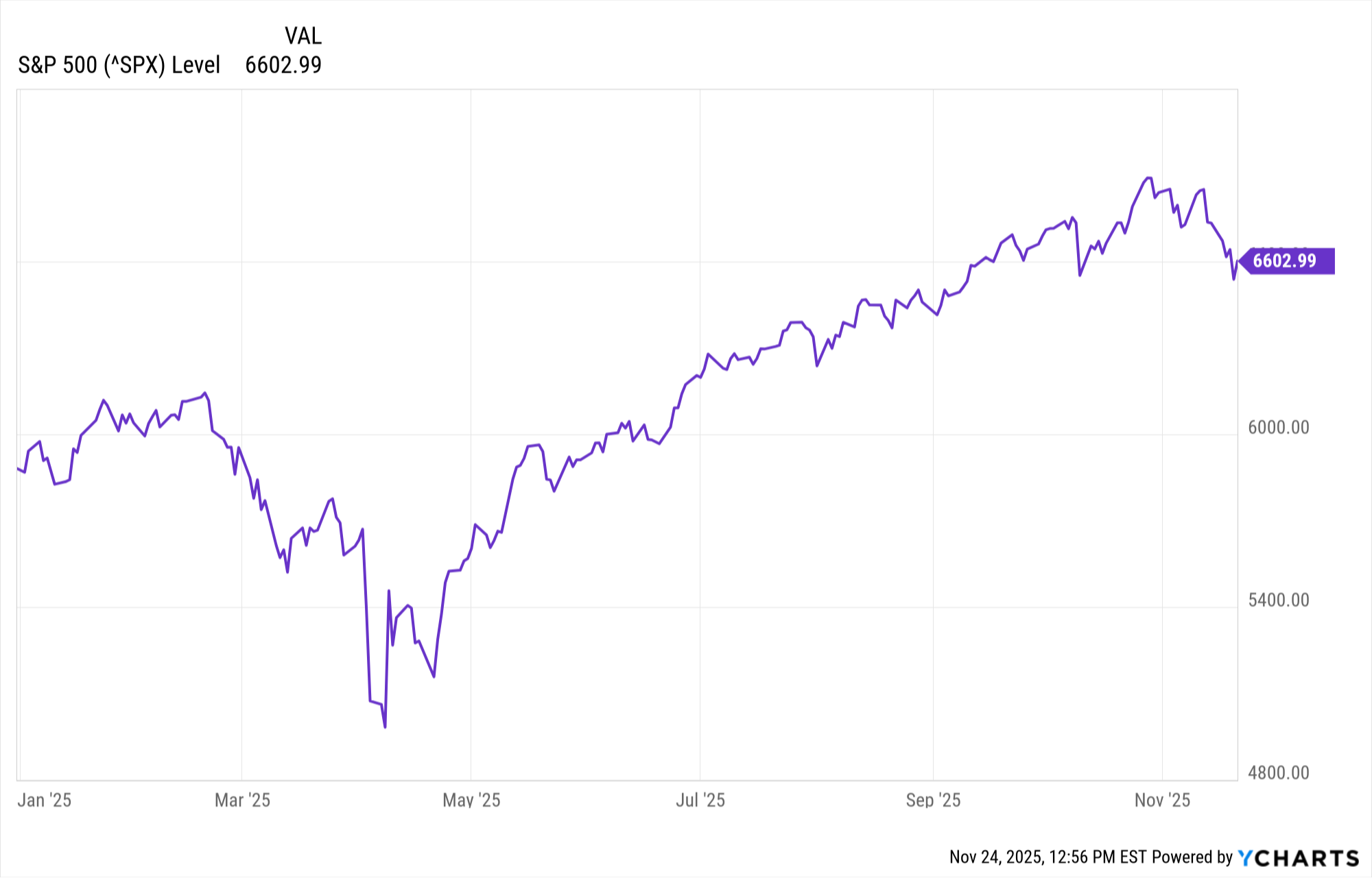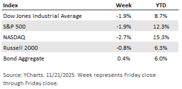 Equity markets endured another volatile week, finishing lower as positive corporate earnings failed to alleviate concerns regarding the AI trade, and newly released economic data raised more questions for the Federal Reserve. However, markets rebounded on Friday, boosted by hopes of another interest rate cut.6 Market volatility is normal and often provides opportunities for lower entry points. The November pullback has been somewhat expected, given the magnitude and steadiness of the recent rally from April’s lows.