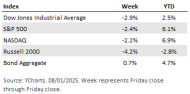 Outlook The Fed's decision to take a wait-and-see stance on the economy yielded a decision to keep the Fed Funds rate steady for now. Historically, the Fed's twelve voters (including the Chairman, Jerome Powell) hammer out a decision behind the scenes. When it comes to voting time, they generally vote unanimously. This time around, however, two dissenters argued in favor of lowering rates. Last week's drama unfolded in the middle of a strong GDP report demonstrating good overall economic growth and a poor employment report showing weak overall employment in July and sharp revisions in May and June.1 The mixed messages from economic updates and a non-unanimous Fed yielded a tick-up in overall market uncertainty. That said, earnings remain decent, and consumers and businesses remain, in our view, in solid shape, leaving us to remain in the cautiously optimistic camp. . . . The U.S. equity markets navigated a complex landscape last week, shaped by a handful of pivotal economic data releases and policy signals. Investors digested the Federal Reserve’s July interest rate decision, alongside fresh insights into the labor market, economic growth, and inflation dynamics. Federal Reserve Holds Rates Steady As widely anticipated, the Federal Reserve maintained the target Federal Funds rate at 4.25 – 4.50%, marking its fifth consecutive pause since December 2024.2 In the press conference, Fed Chair Jerome Powell noted that while we are getting more clarity on tariff rates as the U.S. executes more trade deals, there is still lingering uncertainty around the potential economic impact of newly implemented tariffs, particularly on inflation, which led to the committee maintaining a cautious approach.3 The Fed has been data-dependent thus far and intends to keep a close eye on how the data emerges to formulate a decision at their next meeting. While Powell refrained from signaling a rate cut in September, the futures market responded differently, pricing in a higher probability of easing4 – particularly in light of a softer labor market data released later in the week. Labor Market Shows Signs of Softening The July nonfarm payrolls data revealed a notable slowdown in hiring. The economy added 73,000 jobs, well below the consensus estimate of 106,000. Additionally, downward revisions from the prior two months subtracted roughly 260,000 jobs from the total, bringing the three-month average down to 35,000, a sharp decline from the 127,000 monthly average in the preceding quarter. The unemployment rate edged up to 4.2% (from 4.1%, still historically low), and the labor force participation rate fell to 62.2%, its lowest level since late 2022. Despite these signs of softening, wage growth remained resilient, rising 3.9% year-over-year and continuing to outpace inflation, which is hovering around 2.8%. This suggests that real wage growth remains positive, offering some support to consumer spending. Economic Growth and Inflation In contrast to the labor market, the advance estimate of second-quarter GDP showed a surprisingly strong 3.0% annualized growth rate, marking a sharp rebound from the 0.5% contraction seen in Q1. The headline figure was boosted by a significant decline in imports (which many businesses had spiked in Q1 to front-run tariffs). Consumer spending also improved, particularly in durable goods, with auto sales rebounding after a weak start to the year. However, service sector spending remained soft, with notable declines in air travel and electricity consumption.6 Lastly, the Personal Consumption Expenditures (PCE) Price Index, the Fed’s preferred inflation gauge, showed a modest increase in July. Core PCE, which excludes food and energy, rose 0.3% month-over-month and 2.8% year-over-year, roughly in line with expectations. While inflation remains above the Fed’s 2.0% target, the pace of price increases has moderated, and inflation remains within manageable bounds. Overall, the economy is expanding, inflation appears contained, and trade dynamics are becoming clearer; however, a cooling labor market may increase concern, prompting the Federal Reserve to consider rate cuts soon. |