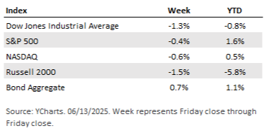 Outlook Four concerns have been on top of mind for many investors this year: 1) DOGE-related layoffs impacting unemployment, 2) immigration policies negatively affecting the jobs market, 3) tariffs choking the supply of goods and triggering inflation, and 4) geopolitical concerns (most notably regional wars) sowing uncertainty. So far, 2025 has confounded those who have been overly concerned with stubbornly decent data related to solid employment, continued economic growth, and reasonable inflation. Further, corporate earnings have continued to climb, and defaults have remained muted. This puts many level-headed investors somewhere between the cautious and optimistic camps - or both. We see some evidence that spending is set to moderate, such as 4 months of increases in the Personal Savings Rate.1 However, we do not see significant distress for the majority of companies or in the banking sector. We remain in both the cautious and optimistic camp. . . . U.S. equity markets slid sharply on Friday, reversing all of the week's gains and ending in the red. The sharp decline was largely due to increased escalation in the Middle East between Israel and Iran that led to direct military confrontation. Both countries sent missile strikes aimed at each other, sending oil prices higher. Aside from geopolitical tensions, the markets also digested some key inflation data and received an update on trade developments with China. On Wednesday, following two days of negotiations in London, Trump announced a trade deal with China. He posted to social media, indicating the deal was “done, subject to final approval” from Chinese President Xi Jinping. The deal states the U.S. will impose a 55% tariff on Chinese imports (previously 145%), while China will apply a 10% tariff on U.S. goods. More notably, the terms show China has agreed to resume exports of rare earth minerals (that are critical for the tech and defense industries); in return, the U.S. will allow Chinese students to attend American universities.2 As for the economic calendar, the Consumer Price Index (CPI) and Producer Price Index (PPI), key inflationary reports were published this week. Both sets of inflation data surprised to the downside (better-than-expected). Headline CPI came in at 2.4%, while headline PPI came in at 2.6%. Overall, inflation remains well below its peak level (from 2022 when CPI hit 9%) and continues to trend towards the Fed’s long-term target of 2.0%. It appears tariffs have not yet contributed to higher inflation as many had expected. One reason for this is perhaps because businesses have built up inventories in anticipation of higher costs and have continued to do so during the 90-day pause. This should help alleviate pricing pressure in the meantime. In addition to inflation, other key fundamental data released so far this year have held up solidly despite trade and geopolitical uncertainties. While U.S. GDP (Gross Domestic Product) softened in the first quarter due to a spike in business inventories, growth appears to be tracking very strongly around 3%, according to the Atlanta Fed’s GDPNow forecast.3 This is driven by resilience in consumer spending, despite weak consumer sentiment reports. Lastly, the labor market remains steady in what many are calling a “low hiring, low firing” state. The unemployment rate remains around 4.2%, well below the long-term average of around 5.5%. Wage gains have impressively outpaced inflation, up around 3.9%, meaning consumers are benefiting from positive real wage growth.4 |