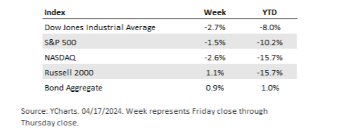 For the week, the S&P 500 finished down -1.5%, the blue-chip Dow fell -2.7%, and the tech-heavy Nasdaq slid -2.6%.