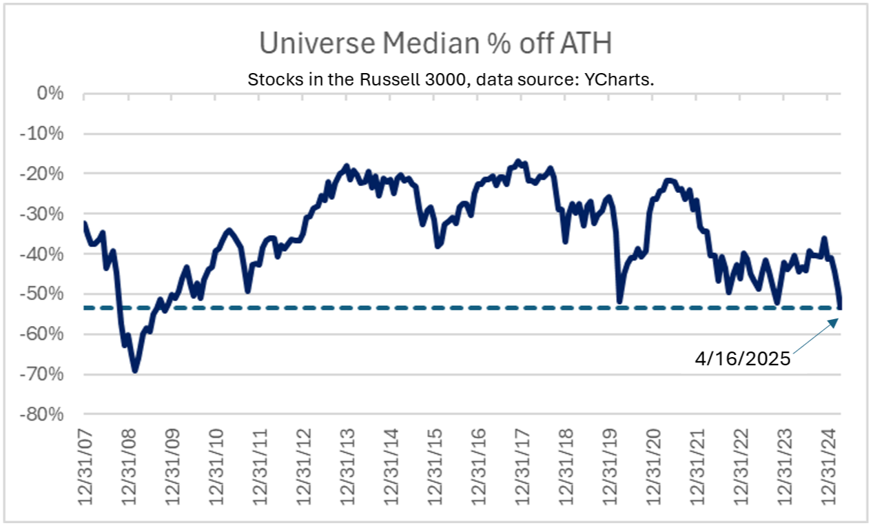 Today, the Russell 3000 Index is down approximately -15% from its high, and therefore the market is in "correction" territory (vs. a bear market, which is generally accepted to be more than -20% off high values). However, when we look at the individual stocks in the Russell 3000 index, we can study how the typical company's stock is performing. So, looking at the 3000 companies, how is the typical stock performing? The median percent-off-high is -53% according to our analysis collected from our data source, YCharts. This means at least half the stocks are down more than -53% off their own high values. This is historically significant and is approximately the same as March 2020, when Covid panic selling occurred, but not quite as stretched as the Global Financial Crisis (2009).
