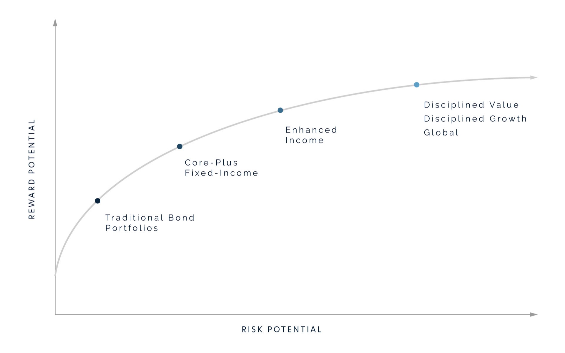 This graphic is for illustrative purposes only. It is not indicative of actual strategy performance, and is used to illustrate the spectrum of strategies made available to clients based on varying levels of potential risk and potential reward. Clients invested in the above or similar strategies may experience investment results that are materially different from the general parameters reflected above. The above does not represent actual trading using client assets, and does not incorporate economic and market factors that may impact overall investment performance. Please refer to the disclosures for more information in this respect.