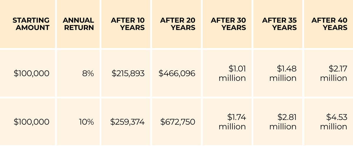 When investing, you allow your money the opportunity to grow over time. As the table below illustrates, if you received a hypothetical return of 8 percent or 10 percent on a $100,000 investment, the power of compounding has the power to work for you over longer periods of time.8