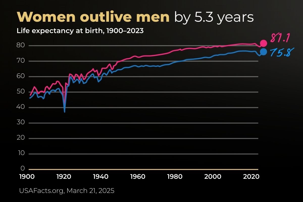 On average, women in the United States live about five years longer than men. While both men and women are living longer than at the beginning of the last century, a gap remains. In the U.S. in 2023, the life expectancy for men was 75.8 years. For women, it was 81.1 years.1