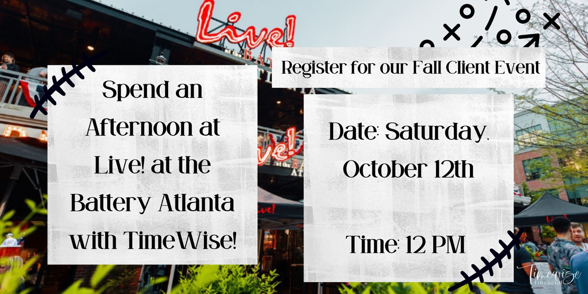 Join us at our Fall client event on Saturday, October 12th at Live! at the Battery Atlanta! We rented the 2nd floor of Sports & Social Atlanta (the sports bar of Live! at the Battery Atlanta) to spend quality time with you outside the conference room. We hope to enrich our connection with you, your family, and your friends during this fun, laid-back afternoon. This event will be a college football watch party featuring big screens, fresh food, refreshing drinks, and great company.